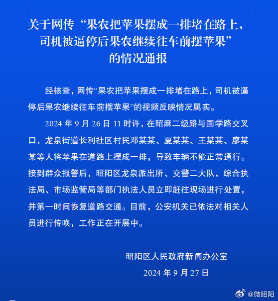 9月26日11时许,在昭麻二级路与国学路交叉口,龙泉街道长利社区村民邓某某、夏某某、王某某、廖某某等人将苹果在道路上摆成一排,导致车辆不能正常通行。接到群众报警后,昭阳区龙泉派出所、交警二大队,综合执法局、市场监管局等部门执法人员立即赶往现场进行处置,并第一时间恢复道路交通。目前,公安机关已依法对相关人员进行传唤,工作正在开展中。