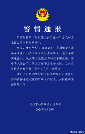 据界面新闻,杭州市公安局萧山区分局9月29日发布警情通报:日前网传的“网红遭人持刀抢劫”系该局正在侦办的一起刑事案件。经查,2024年9月24日18时许,犯罪嫌疑人周某某(男,36岁)窜至萧山区盈丰街道一地下车库实施抢劫,致受害人轻微受伤和其车辆受损。在受害人协助下,周某某被警方当场控制,目前已被依法刑事拘留,案件正在进一步侦办中。