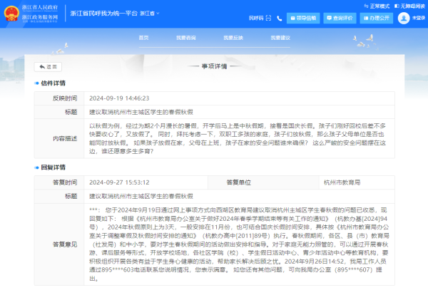 日前有杭州家长在浙江省民呼我为统一平台上建议取消该市主城区学生的春假秋假。9月27日,杭州市教育局答复称,对于家庭无能力照管的,教育局、中小学要积极组织开展各类有益于学生身心健康的活动,帮助家长解决后顾之忧。