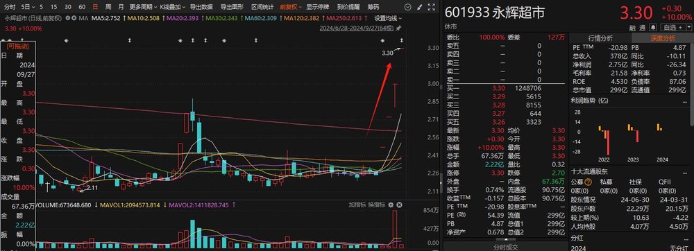 二级市场方面,永辉超市周五收盘四连板,9月23日迄今股价累涨46.67%。截至目前永辉超市市值为299亿元,相较于名创优品公告收购其股份时的204亿元,市值涨了近百亿元。