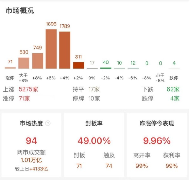据财联社盯盘数据显示,沪深两市成交额突破1万亿元,较昨日此时放量超4000亿元,刷新历史最快万亿纪录。