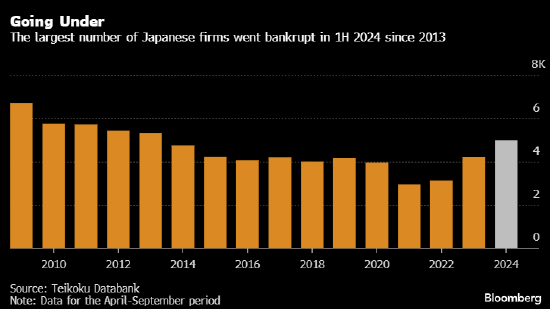 据新浪财经,在截至9月份的六个月里,日本企业破产数量创下2013年以来最高水平,企业越来越多地受到成本上升的冲击。
