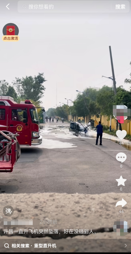 据红星新闻,10月8日,有网传视频称河南省许昌市魏都区,某产业园区内有直升机掉落,相关网传视频中,有架黑色直升机横倒在地面上,附近停放有消防车,消防人员正在对直升机喷水处置。
