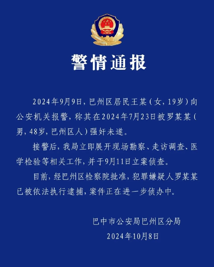 据中国新闻周刊,巴中市公安局巴州区分局通报:2024年9月9日,巴州区居民王某(女,19岁)向公安机关报警,称其在2024年7月23日被罗某某(男,48岁,巴州区人)强奸未遂。接警后,我局立即展开现场勘察、走访调查、医学检验等相关工作,并于9月11日立案侦查。目前,经巴州区检察院批准,犯罪嫌疑人罗某某已被依法执行逮捕,案件正在进一步侦办中。据大皖新闻,10月7日,有网民发帖实名举报四川省巴中中学纪委书记罗某对其实施猥亵、强暴,事后还遭到对方威胁,引发关注。对此,当地纪委回应,已收到举报,正在调查核实。
