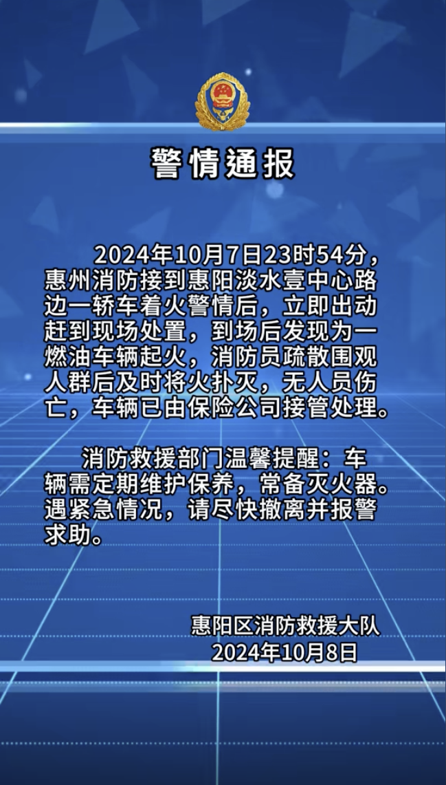 据界面新闻,网传视频显示,10月7日深夜,广东省惠州市惠阳区街头一辆保时捷轿车突然起火燃烧。10月8日,惠阳区消防救援大队通报,10月7日23时54分,惠州消防接到惠阳淡水壹中心路边一轿车着火警情后,立即出动赶到现场处置,到场后发现为一燃油车辆起火,消防员疏散围观人群后及时将火扑灭,无人员伤亡,车辆已由保险公司接管处理。