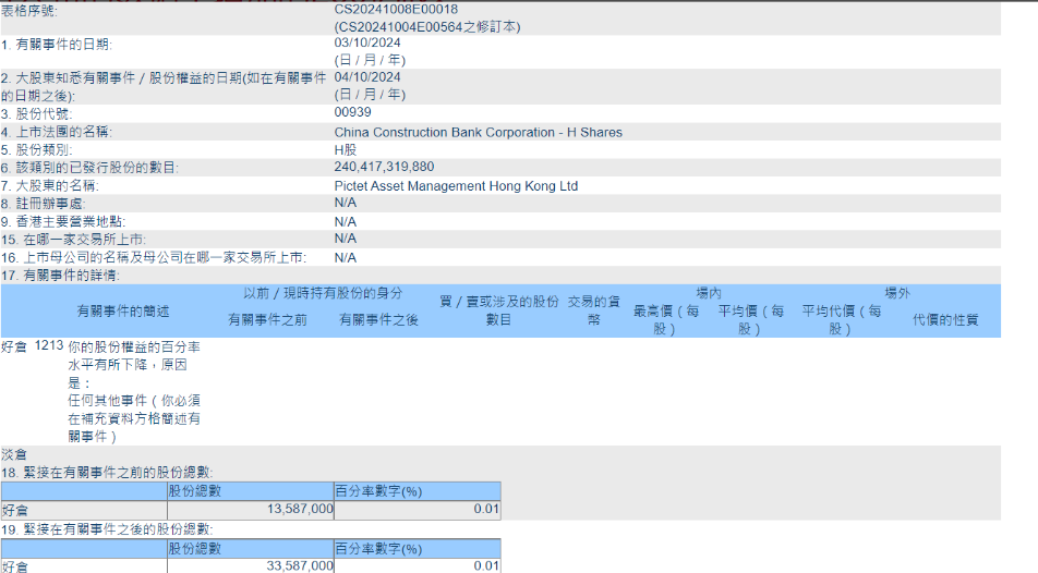 据财联社,据港交所披露易今日修正的数据,瑞士百达资产管理10月3日增持建设银行H股(00939.HK)2000万股,而非昨日公布的数据中增加的200亿股。