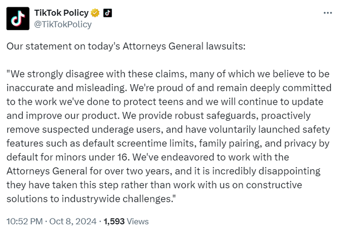 当日,TikTok在社交媒体平台X发布声明回应称,公司强烈反对这些说法,并认为其中许多说法不准确且具有误导性。TikTok表示,其已提供强有力的保障措施,并自愿为16岁以下用户默认推出了屏幕时间限制和隐私等功能。声明称,“两年多来,我们一直在努力与各州检察长合作。令人难以置信的是,他们采取了这一行动,而不是与我们合作,为全行业的挑战寻求建设性的解决方案”。