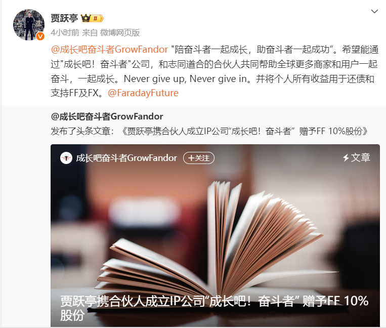 另外,投资FF获得的收益,未来也主要用于还债。天眼查App显示,“成长吧!奋斗者”关联公司成长奋斗者网络科技(北京)有限公司成立于今年6月,法定代表人为张莘鑫,注册资本1万人民币。知识产权信息显示,近期,该公司已申请注册上百枚“成长吧奋斗者”“成长吧追梦者”“Grow Dreamer”“Grow Fandor”商标。