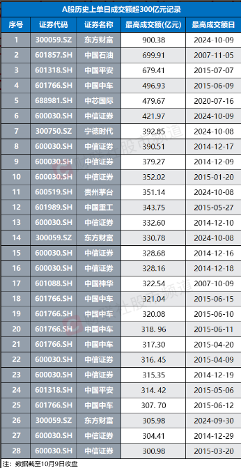 据财联社,东方财富全天成交金额达900.38亿元,打破此前尘封近17年的A股市场个股单日成交金额历史纪录。此前该纪录为中国石油A股上市首日2007年11月5日创出的699.9亿元。从历史上看,A股共有28次单只个股成交金额超300亿元,中国石油、中国平安历史成交金额曾超600亿元。