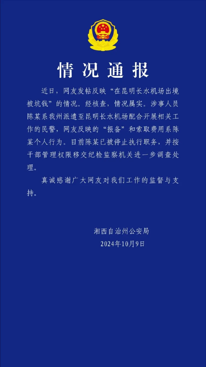据红星新闻,警方通报旅客在昆明长水机场出境被坑钱:
