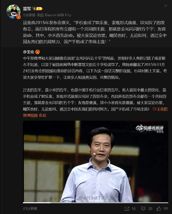 据微博数码,小米@王化 在微博发布视频,还原2015年11月发布会上雷军的讲话内容。雷军随后转发表示:金光闪闪五个字出自2015年发布会,被很多人误解。