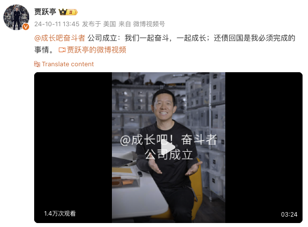 据界面新闻,10月11日,法拉第未来(FF)创始人贾跃亭在微博发布视频,称“还债回国是我必须完成的事情。”据了解,贾跃亭日前与来自全球的10多位合作伙伴共同成立“成长吧!奋斗者”新公司。贾跃亭表示,支持FF和还债是创立这家公司的初心,因此他把个人10%的“成长吧!奋斗者”股份赠予FF。同时,贾跃亭未来在“成长吧!奋斗者”获得的所有收益,包括劳务、IP相关收益及股权收益,这些收益一半注资到FF,另一半用于继续清偿国内债务。贾跃亭还强调:“我的价值观是绝不允许说假话。”