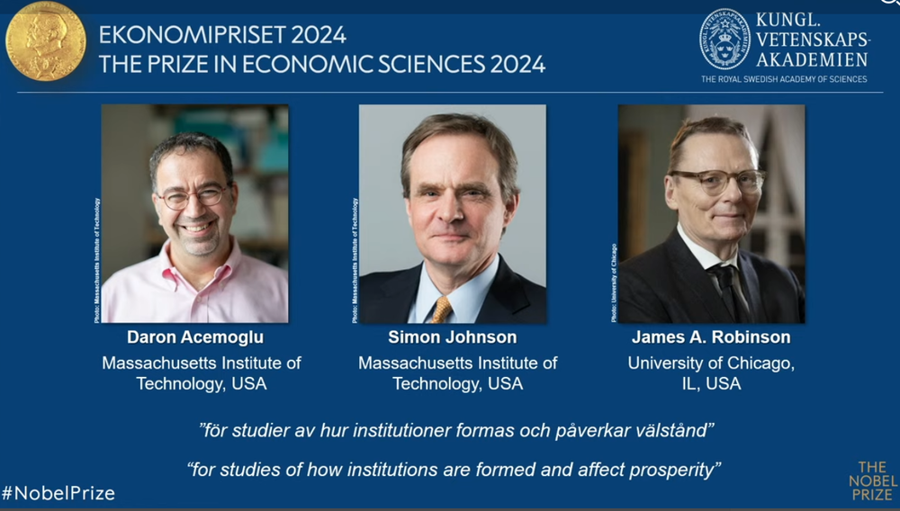 据财联社,瑞典皇家科学院宣布,将2024年诺贝尔经济学奖授予达龙·阿西莫格鲁、西蒙·约翰逊和詹姆斯·A·罗宾逊,以表彰他们“研究制度如何形成并影响繁荣”。这些获奖者对长期影响国家经济繁荣的因素做出了创新性研究。奖金为1100万瑞典克朗,由获奖者平分。