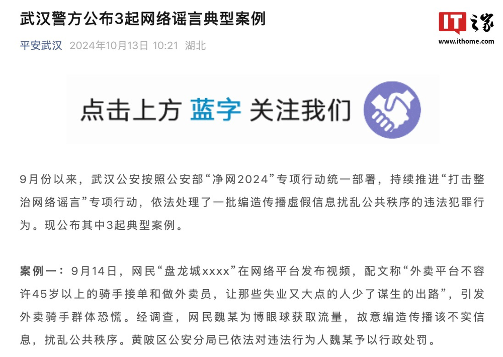 IT之家参考“平安武汉”官方公众号 10 月 13 日官方通报获悉,经查,发布视频的“盘龙城 xxxx”网民魏某为博眼球编造传播该不实信息,黄陂区公安分局已依法对违法行为人魏某予以行政处罚。