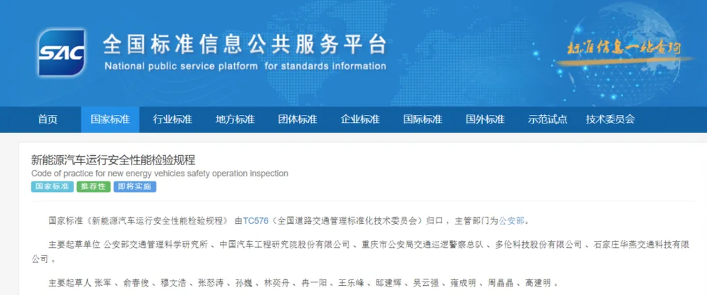 全国标准信息公共服务平台日前显示,国家标准《新能源汽车运行安全性能检验规程》(GB/T 44500-2024)将于明年3月1日起正式实施。据悉,该标准是我国首部专门针对新能源车的安全检测标准,将成为新能源车年检的检验标准,适用于纯电动车和插电式混合动力(包含增程式)汽车。