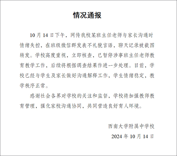 据界面新闻,西南大学附属中学10月14日发布情况通报称,当日下午,网传该校某班主任老师与家长沟通时情绪失控,在班级微信群发表不礼貌言语,聊天记录被截图转发。学校高度重视,立即核查,已暂停涉事班主任老师教育教学工作,后续将根据调查结果作进一步处理。目前,学校已经与学生及家长做好沟通解释工作,学生情绪稳定,教学秩序正常。