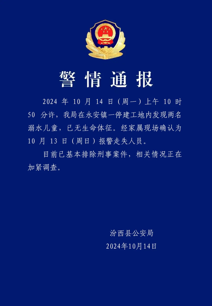 据界面新闻,山西汾西县公安局10月14日晚通报,10月14日(周一)上午10时50分许,汾西县公安局在永安镇一停建工地内发现两名溺水儿童,已无生命体征。经家属现场确认为10月13日(周日)报警走失人员。目前已基本排除刑事案件,相关情况正在加紧调查。