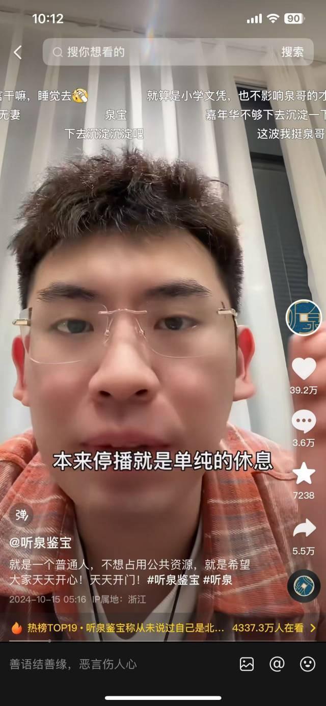 10月15日,“听泉鉴宝”发视频回应称:从未说过自己是北大的。他说因为最近身体状况很差,最初只是想休息一下,没想到出现了大量不实信息。他说,学历信息是账号注册之初填写的,自己从未伪造北京大学的证书,也没有在直播以及任何地方使用北京大学的标签。他说自己只是个热爱古玩的普通人,想用娱乐的方式让人们了解传统文化。