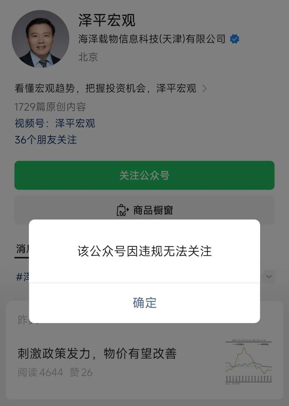 10月15日晚间,任泽平公众号“泽平宏观”因违规无法关注,视频号同样显示“此账号已被禁止关注”。