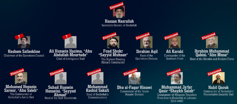 据央视新闻,当地时间15日,以色列国防军公布一张图片,显示真主党高级军事领导层除两名成员外都已经确认被打死。这两人是哈希姆·萨菲丁以及另一名黎真主党情报官员。