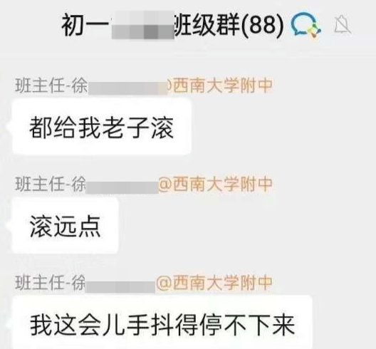 10月14日,多张群聊截图显示,一个疑似有88名群成员的西南大学附属中学一初中班级群里,班主任徐老师疑似情绪崩溃大发脾气。聊天记录显示,徐老师先是在上午时表示,她理解家长对学生的关心,但是她作为一个人现在情绪不稳定,没有办法处理班级上每一个问题,希望大家谅解。到了中午,该老师疑似情绪崩溃,发布多条情绪化言论,让所有群成员离她远点,“都给老子滚”。有家长称:“作为老师,说这样的话不觉得有问题吗?”徐老师回答:“想告就去告”“我已经爆炸了”……