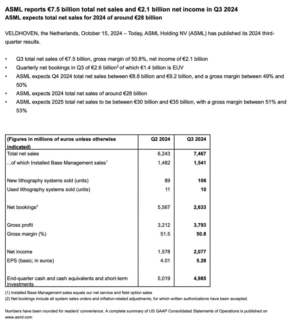 而更令市场震惊的是,阿斯麦第三季度订单额仅为26亿欧元,几乎只达到市场预期的54亿欧元的一半。据财报数据,阿斯麦三季度实现净销售额75亿欧元,毛利率50.8%,净利润21亿欧元;公司预期四季度销售额在88亿欧元至92亿欧元之间,毛利率介于49%-50%,整个2024财年的净销售额将达到280亿欧元左右。