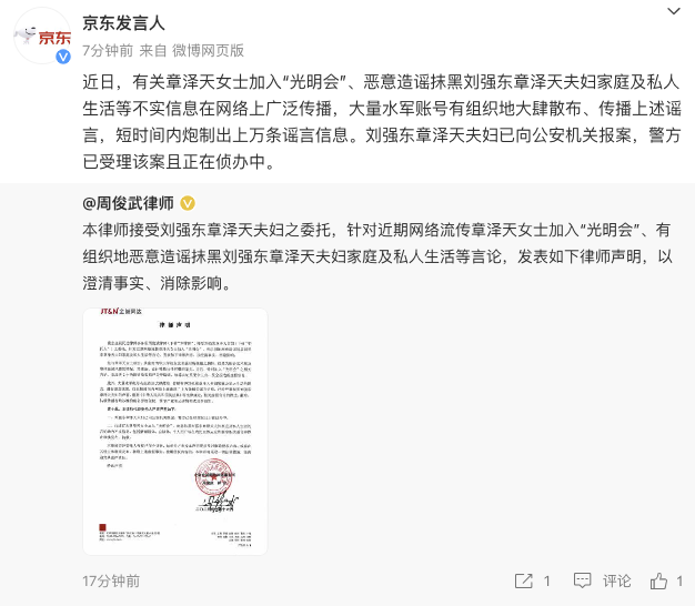 据界面新闻,10月16日,@京东发言人 发布声明称,近日,有关章泽天女士加入“光明会”、恶意造谣抹黑刘强东章泽天夫妇家庭及私人生活等不实信息在网络上广泛传播,大量水军账号有组织地大肆散布、传播上述谣言,短时间内炮制出上万条谣言信息。刘强东章泽天夫妇已向公安机关报案,警方已受理该案且正在侦办中。