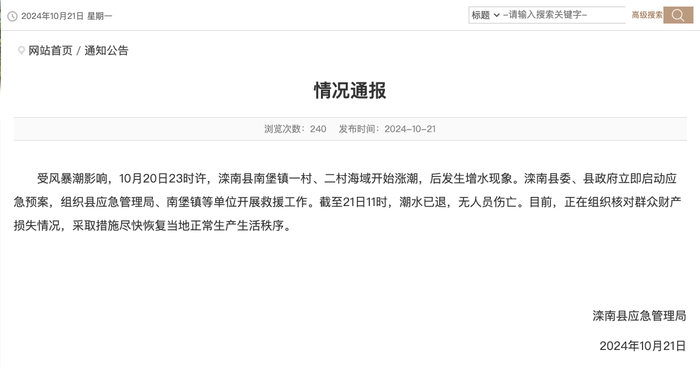 据界面新闻,10月21日,滦南县应急管理局通报,受风暴潮影响,10月20日23时许,滦南县南堡镇一村、二村海域开始涨潮,后发生增水现象。滦南县委、县政府立即启动应急预案,组织县应急管理局、南堡镇等单位开展救援工作。截至21日11时,潮水已退,无人员伤亡。目前,正在组织核对群众财产损失情况,采取措施尽快恢复当地正常生产生活秩序。