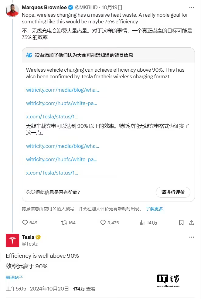 特斯拉对此明确表示,其无线充电系统的效率“远高于 90%”,这一回应让 Brownlee 感到惊讶。在另一位用户的鼓励下,Brownlee 表示:“我承认我错了。迫不及待想看到它上市。”