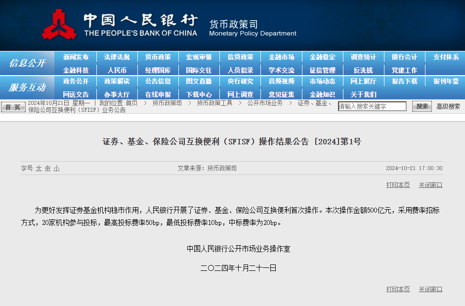 据大河财立方,10月21日,央行发布公告,为更好发挥证券基金机构稳市作用,人民银行开展了证券、基金、保险公司互换便利首次操作。本次操作金额500亿元,采用费率招标方式,20家机构参与投标,最高投标费率50bp,最低投标费率10bp,中标费率为20bp。