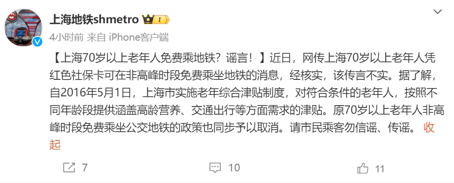 据了解,自2016年5月1日,上海市实施老年综合津贴制度,对符合条件的老年人,按照不同年龄段提供涵盖高龄营养、交通出行等方面需求的津贴。原70岁以上老年人非高峰时段免费乘坐公交地铁的政策也同步予以取消。请市民乘客勿信谣、传谣。