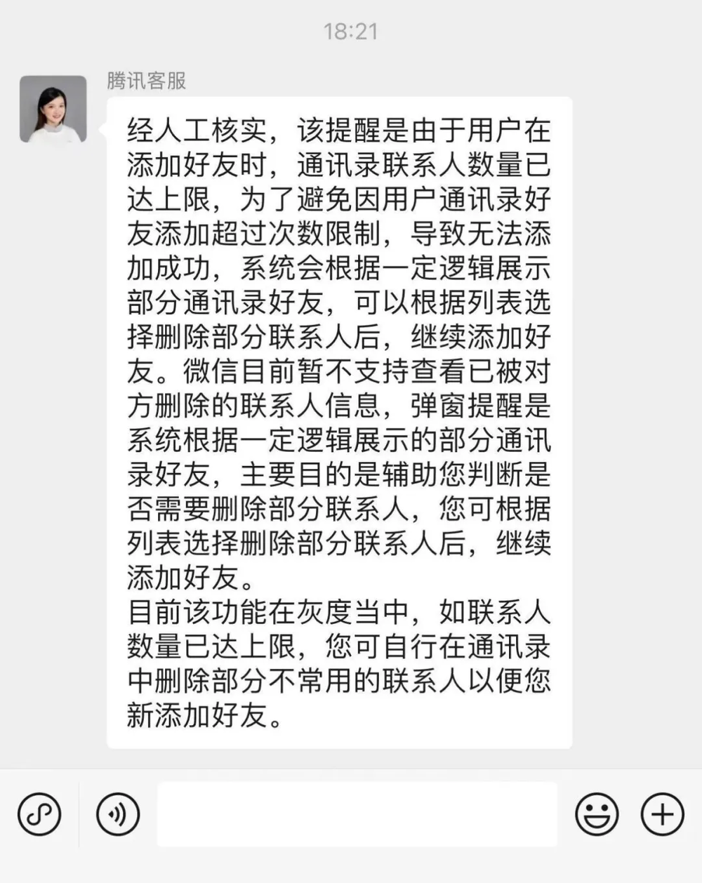 针对这一问题,10月20日中午,记者就这一功能对腾讯客服进行了咨询。对于这一功能,腾讯客服表示,由于用户在添加好友时,通讯录联系人数量已达上限,为了避免因用户通讯录好友添加超过次数限制,导致无法添加成功,系统会展示部分通讯录好友,用于辅助您判断是否需要删除部分联系人,用户可以根据列表选择删除部分联系人后,继续添加好友。