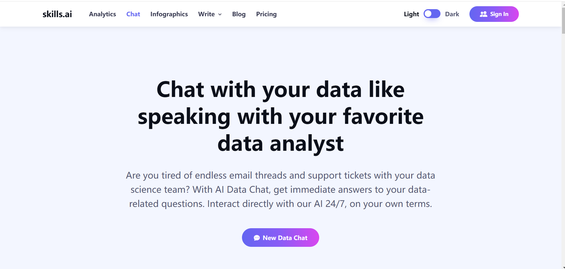 Skills.ai 是一款人工智能驱动的数据分析工具,旨在简化数据分析流程。该平台的关键功能是人工智能数据聊天功能,充当虚拟数据分析师,能够使用自然语言处理实时回答与数据相关的问题。
