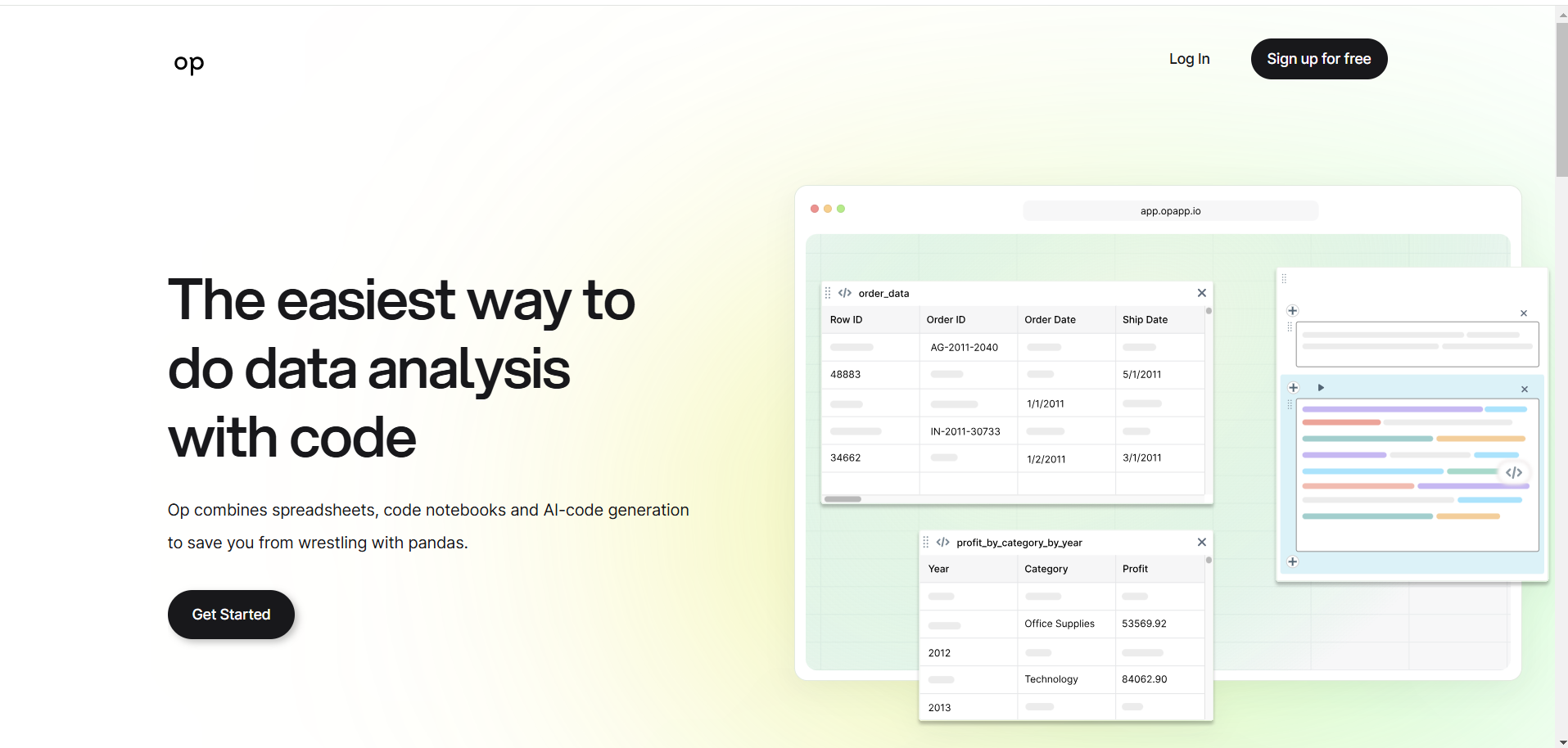 op 是一个数据分析工具,它提供了一种使用代码分析数据的简单有效的方法。它结合了电子表格、Jupyter 笔记本和人工智能聊天来简化数据分析过程。