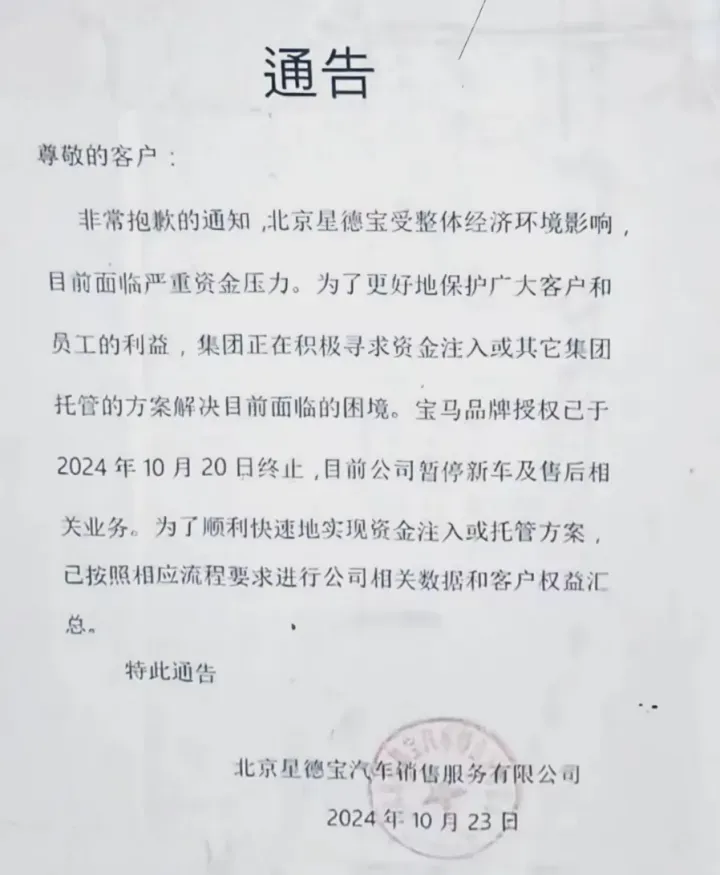 北京星德宝称,受整体经济环境影响,目前面临严重资金压力。集团正在积极寻求资金注入或其他集团托管的方案解决目前面临的困境。宝马品牌授权已于2024年10月20日终止,目前公司暂停新车及售后相关业务。为了顺利快速地实现资金注入或托管方案,已按照相应流程要求进行公司相关数据和客户权益汇总。