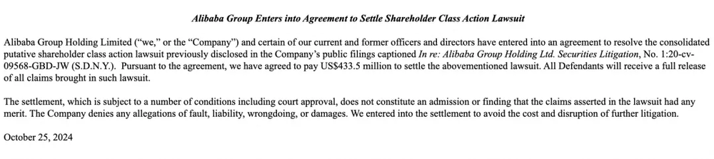 据证券时报,美国当地时间10月25日,阿里巴巴集团发布公告,已同意支付4.335亿美元(约合30.87亿元人民币)和解投资者在美国提起的一桩集体诉讼。