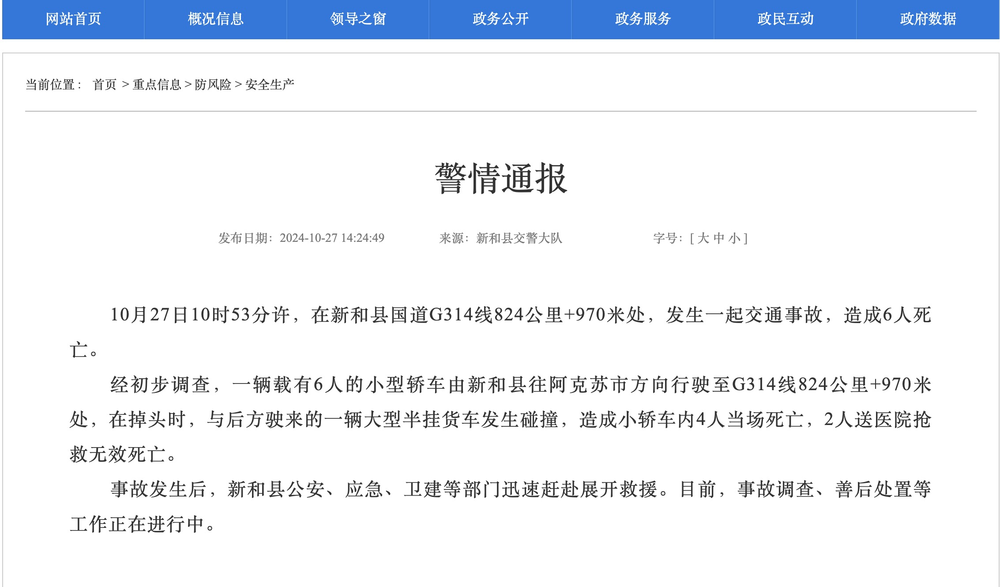 据澎湃新闻,10月27日,澎湃新闻从新疆新和县人民政府官网了解到,当天10时53分许,在新和县国道G314线824公里+970米处,发生一起交通事故,造成6人死亡。