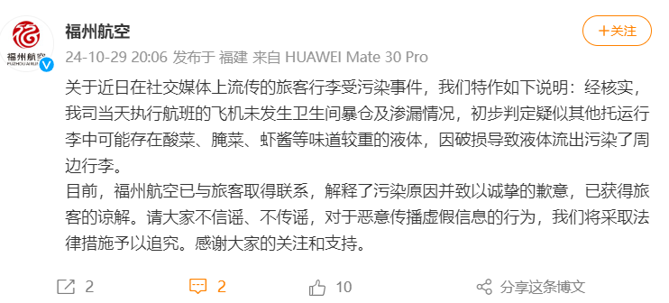 目前,福州航空已与旅客取得联系,解释了污染原因并致以诚挚的歉意,已获得旅客的谅解。请大家不信谣、不传谣,对于恶意传播虚假信息的行为,航司将采取法律措施予以追究。感谢大家的关注和支持。