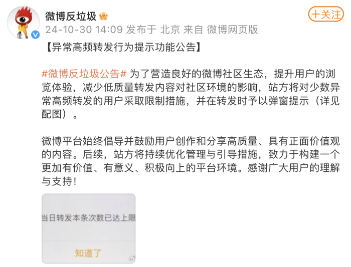 据界面新闻,10月30日,微博表示,为了营造良好的微博社区生态,提升用户的浏览体验,减少低质量转发内容对社区环境的影响,站方将对少数异常高频转发的用户采取限制措施,并在转发时予以弹窗提示。