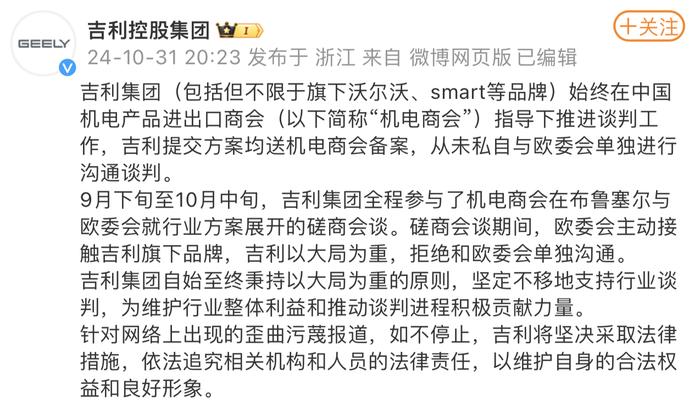 据界面新闻,10月31日,@吉利控股集团 发布声明称,吉利集团(包括但不限于旗下沃尔沃、smart等品牌)始终在中国机电产品进出口商会(以下简称“机电商会”)指导下推进谈判工作,吉利提交方案均送机电商会备案,从未私自与欧委会单独进行沟通谈判。
