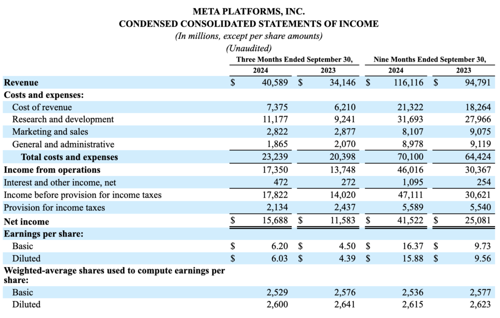 据第一财经,北京时间10月31日,Facebook母公司Meta(NASDAQ: META)发布了截至9月30日的2024财年第三季度财报。财报显示,Meta第三季度总营收为405.89亿美元,较上年同期的341.46亿美元增长19%,超出华尔街分析师预期;净利润为156.88亿美元,较上年同期的115.83亿美元增长35%。