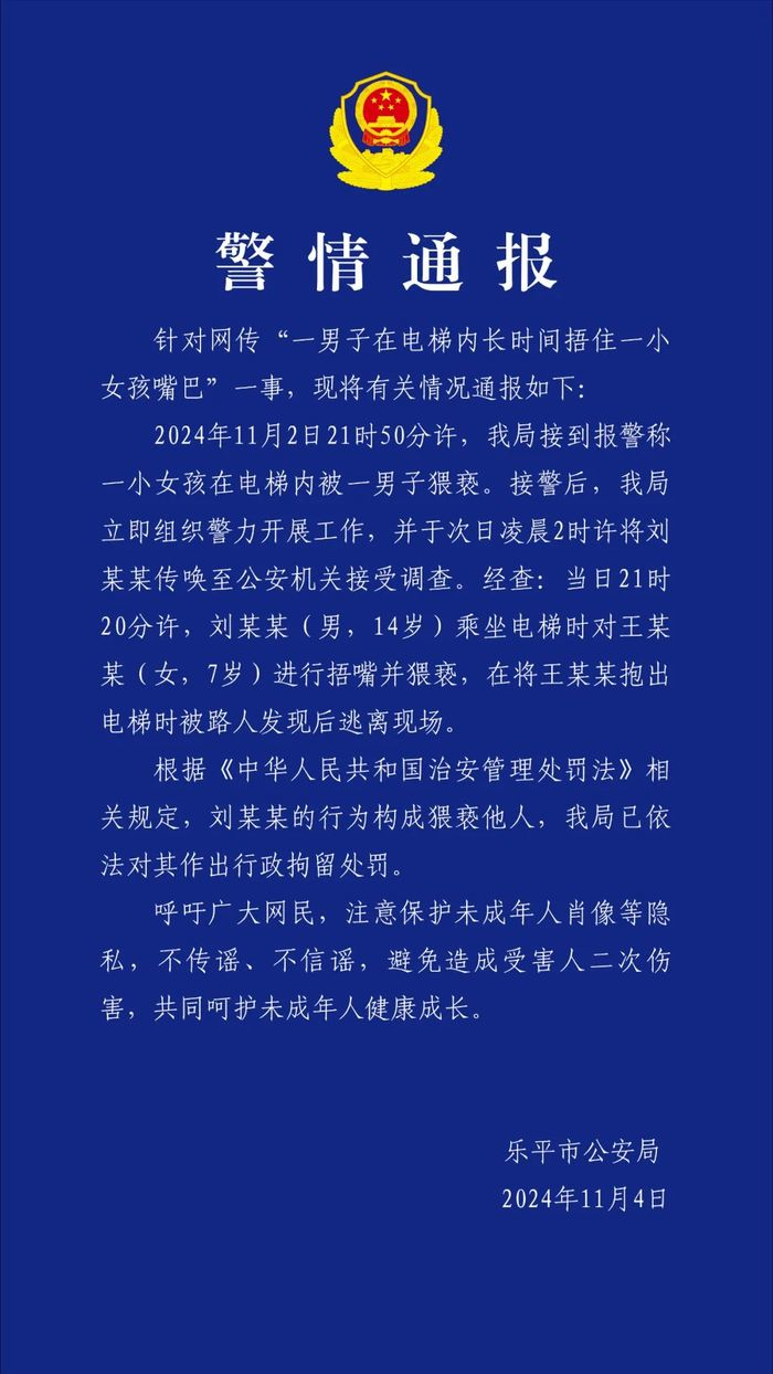 据界面新闻,乐平市公安局11月4日通报,11月2日21时50分许,该局接到报警称一小女孩在电梯内被一男子猥亵。接警后,该局立即组织警力开展工作,并于次日凌晨2时许将刘某某传唤至公安机关接受调查。经查:当日21时20分许,刘某某(男,14岁)乘坐电梯时对王某某(女,7岁)进行捂嘴并猥亵,在将王某某抱出电梯时被路人发现后逃离现场。