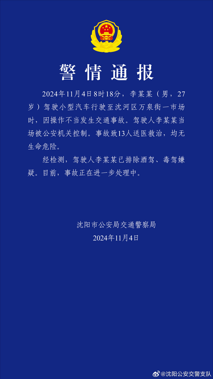据界面新闻,沈阳市公安局交通警察局发布警情通报称,11月4日8时18分,李某某(男,27岁)驾驶小型汽车行驶至沈河区万泉街一市场时,因操作不当发生交通事故。驾驶人李某某当场被公安机关控制。事故致13人送医救治,均无生命危险。
