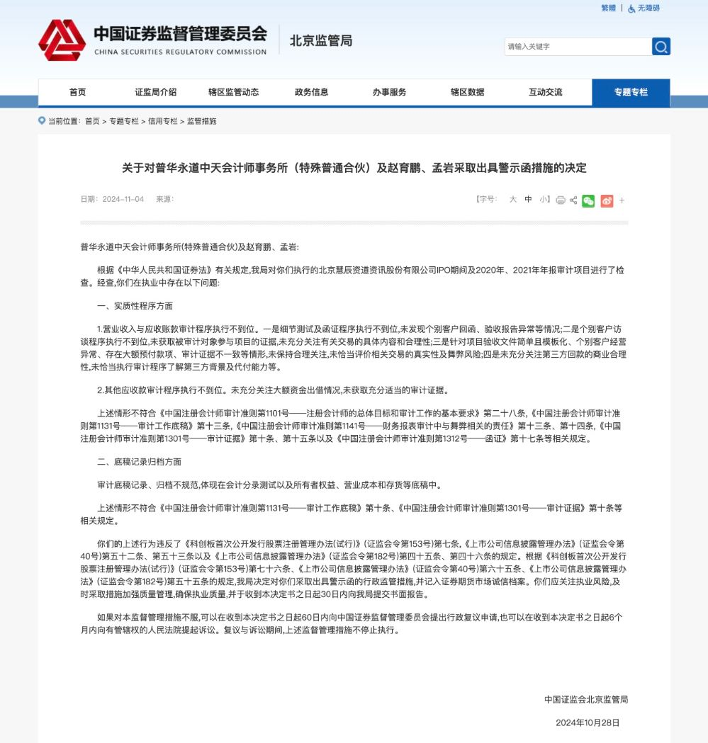 据21财经,北京证监局官网发布消息,因在北京慧辰资道资讯股份有限公司(688500.SH,以下简称“慧辰股份”)IPO期间及2020年、2021年年报审计项目中存在多个问题,对普华永道中天会计师事务所(特殊普通合伙)及赵育鹏、孟岩出具了警示函。