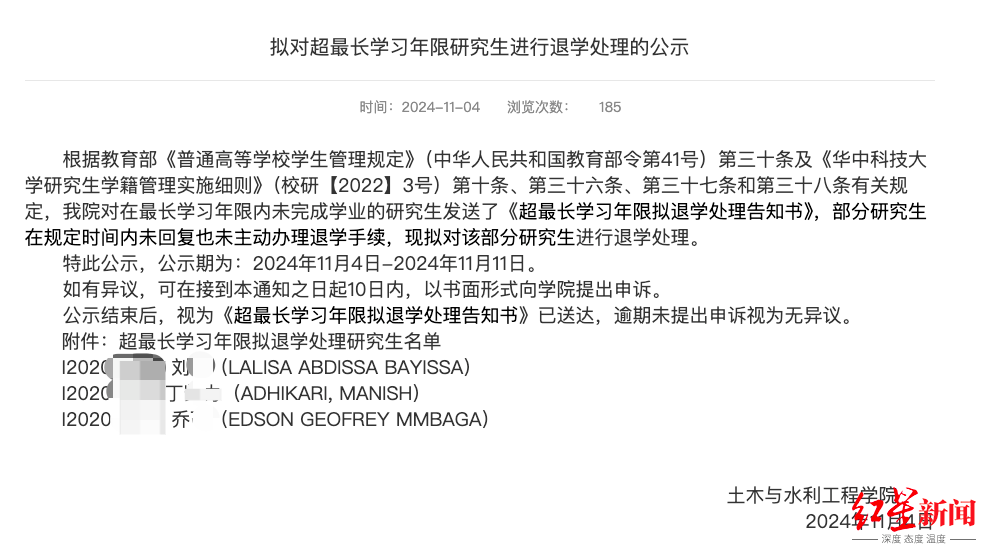 据红星新闻,近日,华中科技大学计算机科学与技术学院“拟对5名超最长学习年限研究生进行退学处理”的公告引发关注,涉事5人为四名留学博士或硕士,以及一名非全日制硕士。