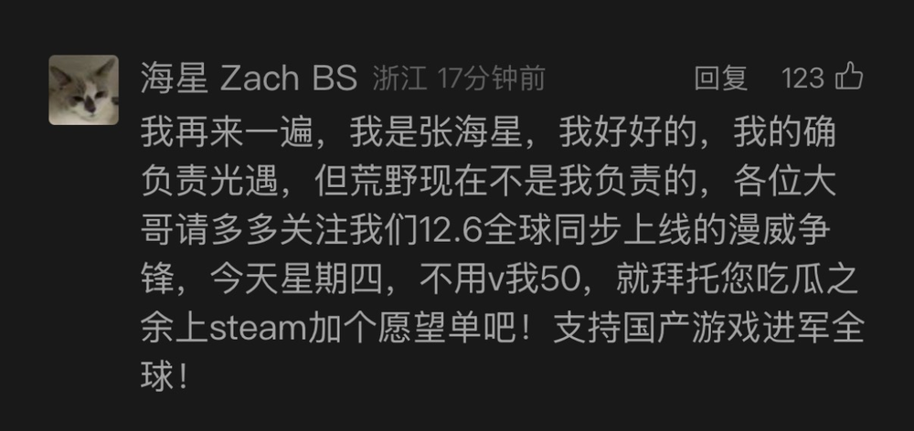 7日晚间,网传截图中负责光遇和荒野游戏的张海星现身某评论区,并针对上述消息做出辟谣。他表示“自己好好的”,并补充称自己的确负责光遇,但不负责荒野。