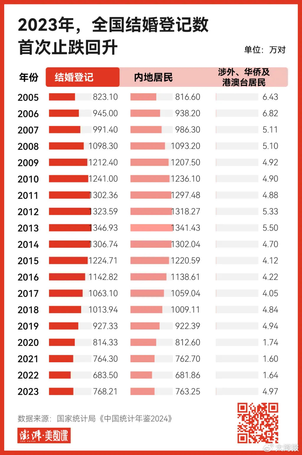 据大河报,近日,国家统计局官网公布了《中国统计年鉴2024》。统计数据显示,2023年全年,全国结婚登记768.21万对,离婚登记360.53万对。