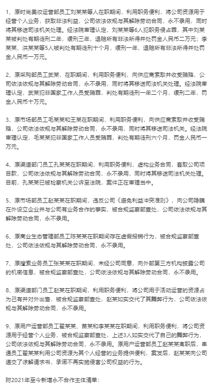 据界面新闻。11月8日,@微博发言人 发布微博反舞弊通报:2021年至今,合规监察部共发现并查处员工舞弊案件9起,17人被解除劳动合同。其中10人因涉嫌犯罪被移送司法机关处理。