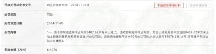 据上游新闻,记者从信用中国网站获悉,11月5日,昭通学院被云南省昭通市昭阳区自然资源局认定非法占用8407.62平方米土地,该局对其作出罚款8.4万元处罚,并责令其退还非法占地。