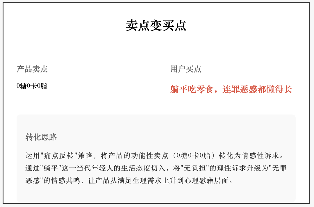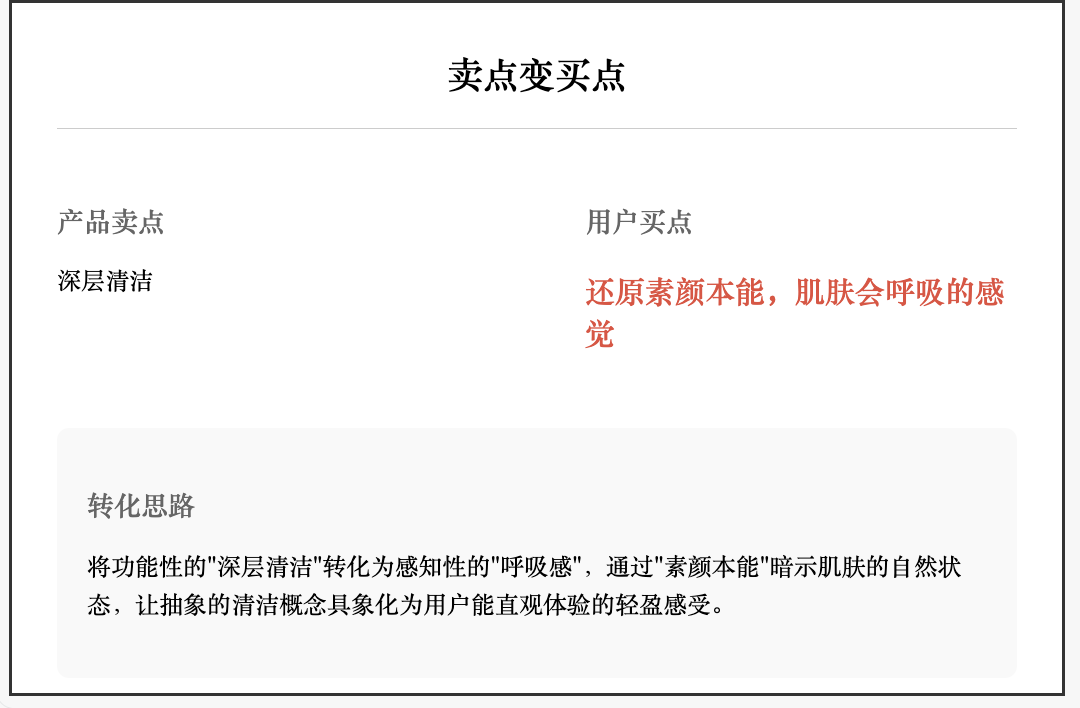 比起让AI写文案,我花了些笔墨来讨论“写什么”,是因为这恰恰是动手让AI写文案前最容易被忽视却最关键的一步。那么下一个问题来了:如何让这个卖点真正打动消费者?